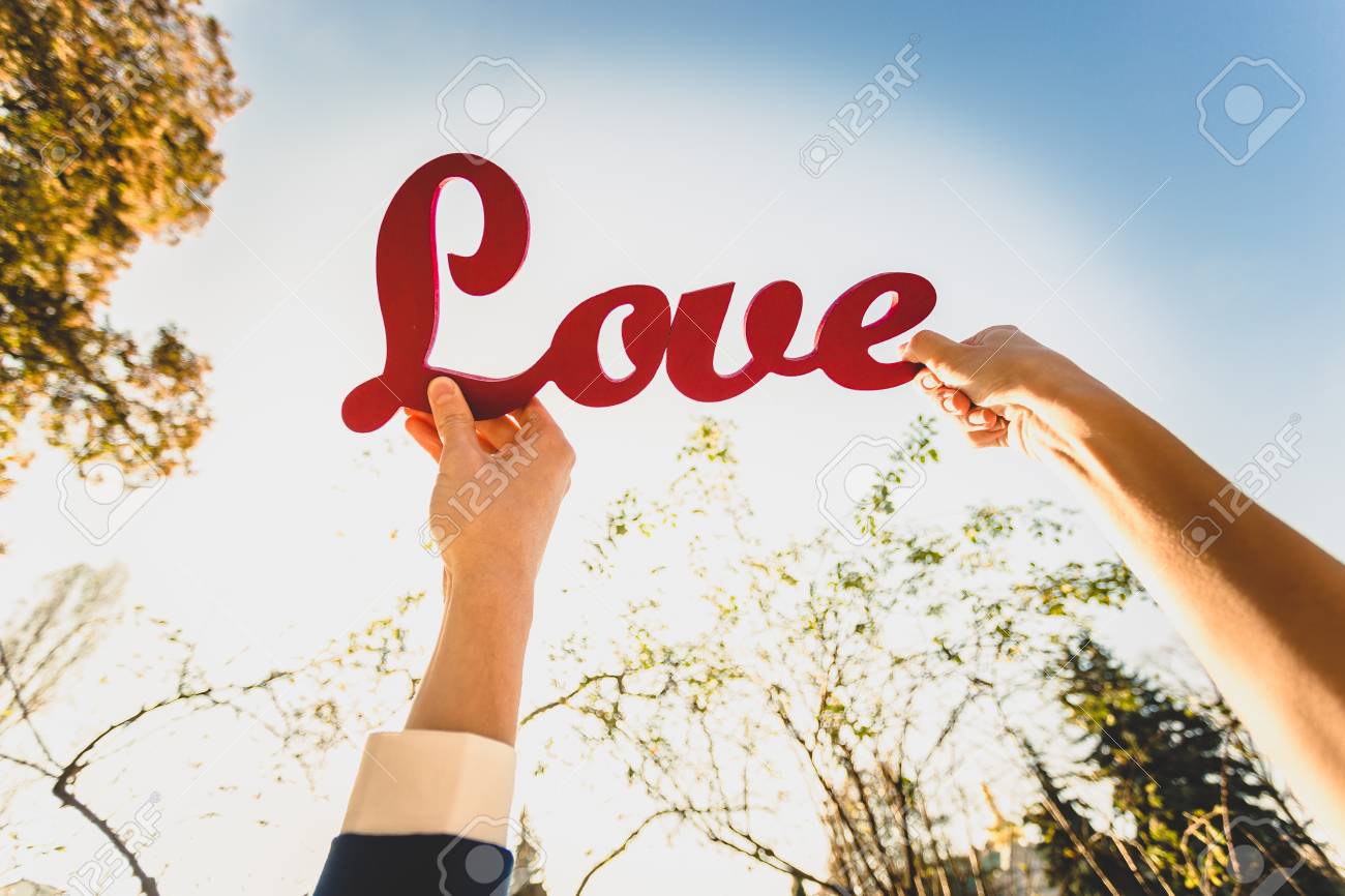 man and woman holding red «Love» sign