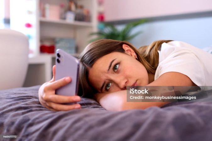 Depressed Teenage Girl Lying On Bed At Home Looking At Mobile Phone