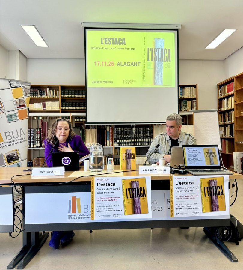 El periodista i escriptor Joaquim Vilarnau va presentar ahir, 17 de novembre, a la Universitat d’Alacant el seu nou llibre “L’Estaca: crónica d’una cançó sense fronteres”, en un acte celebrat en una de les sales de la Biblioteca General del campus. L’autor va explicar al públic universitari el context i la importància d’aquesta obra, que aprofundeix en la creació i transcendència d’una de les cançons més emblemàtiques de la música catalana: “L’Estaca”, composta per Lluís Llach el 1968.